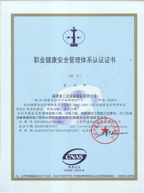 Occupational Health and Safety Management Certification Certificate