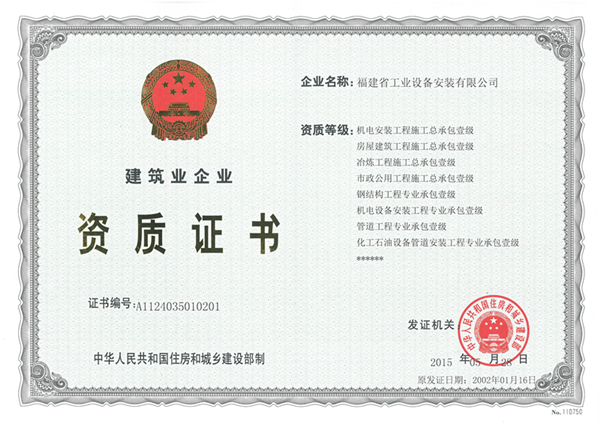 Nowadays, we own the qualifications of general contract grade A for mechanical and electrical construction installation, general contract grade A for housing and building construction, general contract grade A for smelting construction and general contract grade A for municipal public works. In addition, we also have several professional qualifications of specialized contract grade A for mechanical and electrical installation engineering, specialized contract grade A for chemical oil pipeline equipment installation, specialized contract grade A for smelting mechanical and electrical equipment installation engineering, pipeline works, specialized contract grade A for steel structure works, general contract grade B for chemical and petroleum works construction and general contract grade C for electric power works construction.