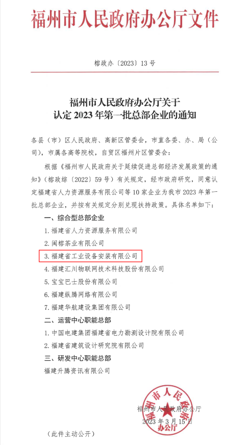 近日,福州市人民政府办公厅发布关于认定2023年第一批总部企业的通知,认定福建安装为福州市综合型总部企业。