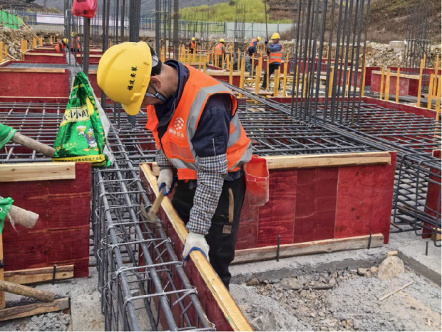 在倒班楼攻坚阶段,项目团队依据测量放线数据精准架设模板支架,对模板的平整度、垂直度及截面尺寸进行校对,同时严格执行支撑体系搭设规范,确保模板承载力万无一失,从源头上杜绝浇筑过程中的胀模、漏浆等质量通病。复工伊始,项目团队便拧紧“安全阀”,扎实开展进场人员的岗前安全培训与技术交底。现阶段正集中力量,全力攻克垃圾池和渣池底板的测量放线、防水铺设及钢筋绑扎作业,为即将到来的底板大体积混凝土浇筑蓄势待发。